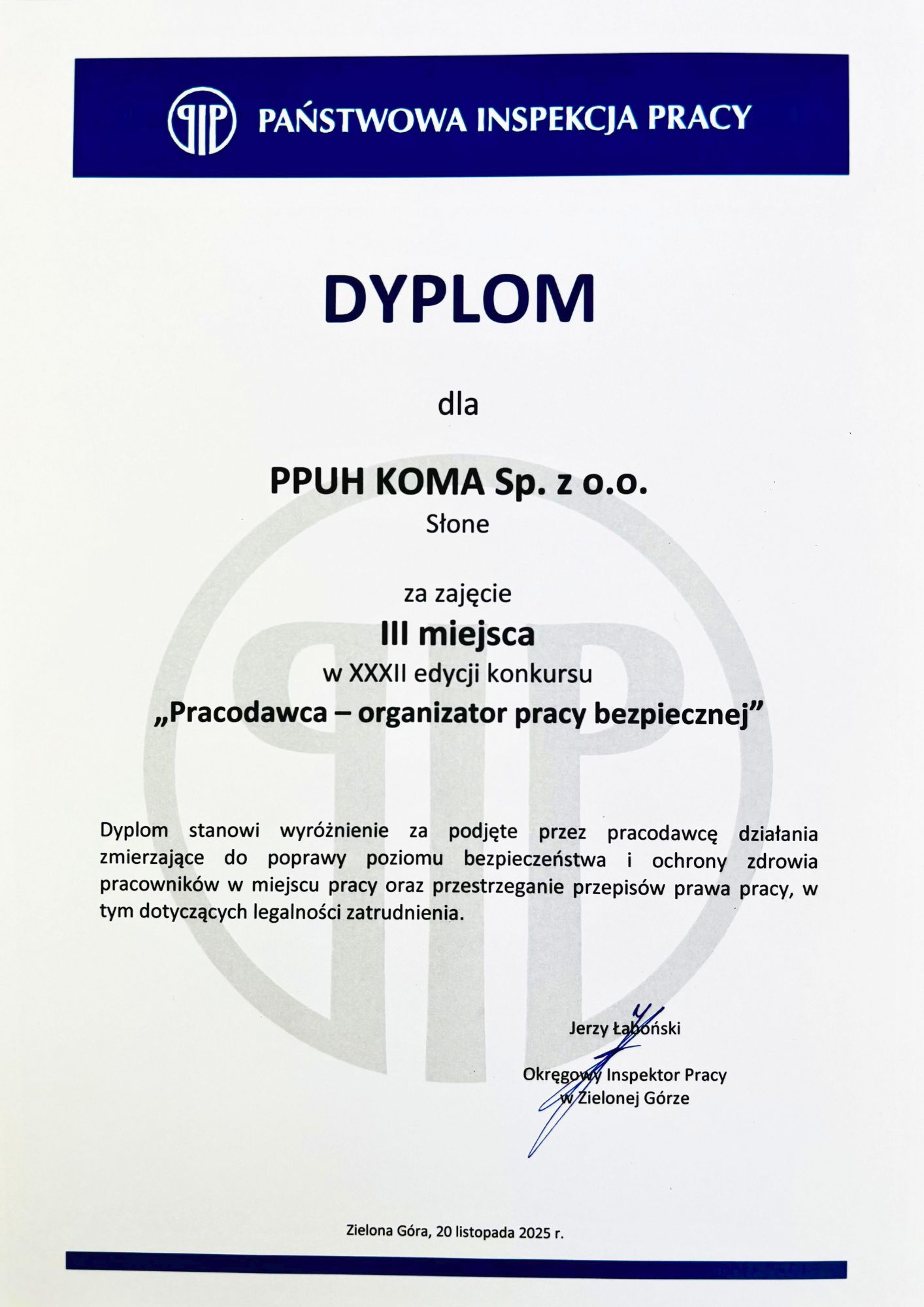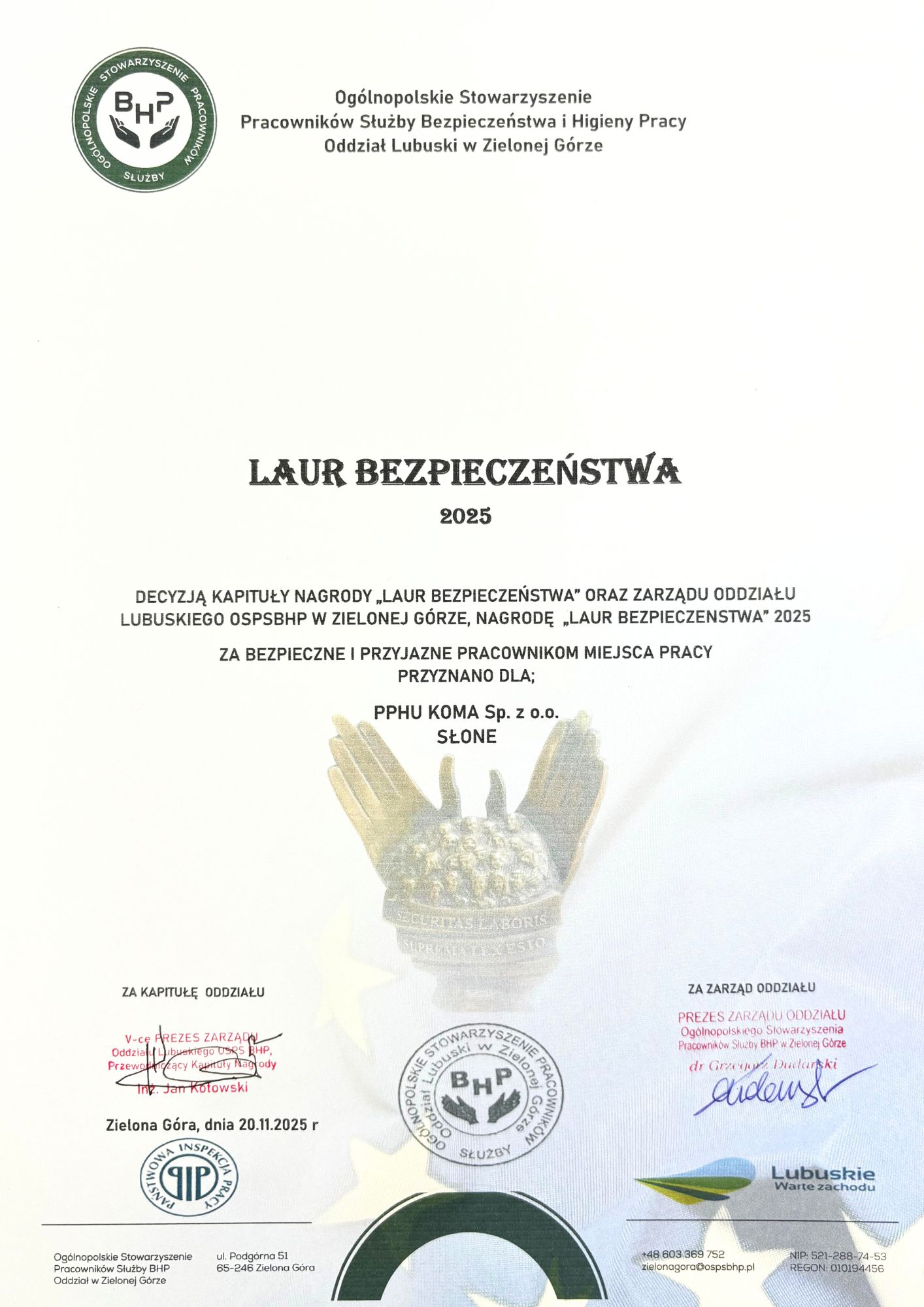 Dnia 20 listopada 2025 roku podczas uroczystej gali w zielonogórskiej Palmiarni PPUH KOMA Sp. z o.o. ze Słonego ponownie znalazła się wśród firm wyróżnianych za szczególną dbałość o bezpieczeństwo pracy. Tego dnia nasza firma odebrała Laur Bezpieczeństwa 2025 oraz wyróżnienie w konkursie Pracodawca organizator pracy bezpiecznej, w którym zajęliśmy trzecie miejsce w kategorii pracodawców do 49 pracowników.